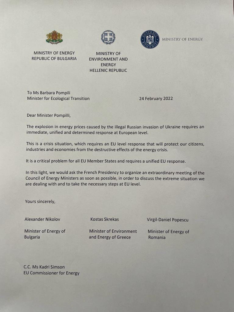 Την επιστολή συνυπογράφουν οι υπουργοί Ενέργειας της Βουλγαρίας και της Ρουμανίας.