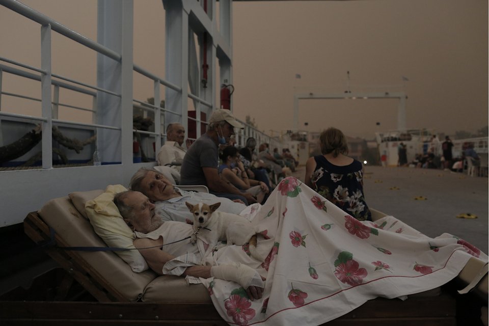 Μια από τις πιο δυνατές φωτογραφίες που είδαν το φως της δημοσιότητας ανήκει στον Κώστα Τσιρώνη του Αθηναϊκού Πρακτορείου Ειδήσεων. Αυτή απεικονίζει ένα ηλικιωμένο ζευγάρι που βρίσκεται στο φέρι μποτ που αναχωρεί από το Πευκί