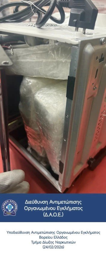 Από την επιτόπια έρευνα στο επίμαχο εμπόρευμα, βρέθηκαν και κατασχέθηκαν επιμελώς κρυμμένες, εντός φούρνου μικροκυμάτων, τρεις συσκευασίες, οι οποίες περιείχαν 2.927 γραμμάρια κοκαΐνης.