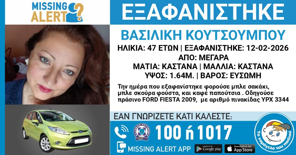 Συναγερμός έχει σημάνει στις Αρχές για την εξαφάνιση της 47χρονης Βασιλικής Κουτσούμπου στις 12/02/2026, από την περιοχή των Μεγάρων.