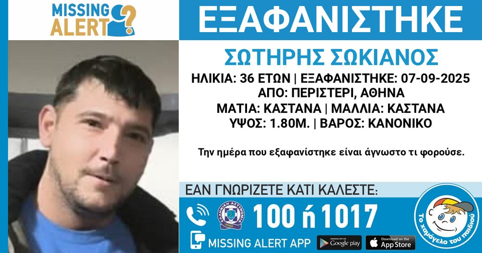 Όπως ανακοίνωσε το Χαμόγελο του Παιδιού, στις 07/09/2025, απογευματινές ώρες, εξαφανίστηκε από την περιοχή του Περιστερίου, ο Σωτήρης (ον.) Σωκιανός (επ.), 36 ετών. Το «Χαμόγελο του Παιδιού» ενημερώθηκε για την εξαφάνιση του, στις 14/09/2025 και προχώρησε στη δημοσιοποίηση των στοιχείων του ενήλικου κατόπιν αιτήματος των οικείων του καθώς ενδέχεται να συντρέχουν λόγοι, οι οποίοι θέτουν τη ζωή του σε κίνδυνο.
