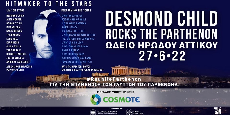 Ο θρυλικός συνθέτης και παραγωγός Desmond Child έρχεται στην Ελλάδα και ενώνει τις δυνάμεις του με τα λαμπρότερα ονόματα της παγκόσμιας μουσικής σκηνής, σε μία μοναδική συναυλία – αφιέρωμα στον ελληνικό πολιτισμό: “DESMOND CHILD ROCKS THE PARTHENON, με Μεγάλο Υποστηρικτή την COSMOTE.