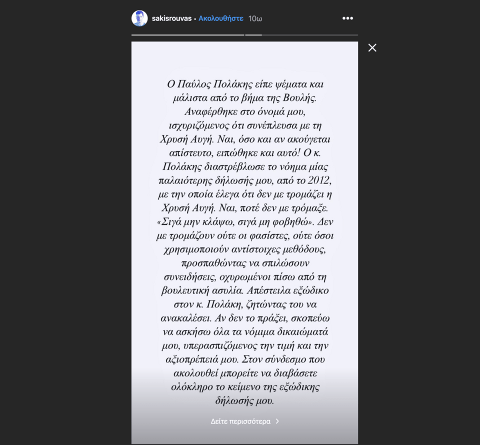Μετά το εξώδικο του γνωστού τραγουδιστή στον βουλευτή του ΣΥΡΙΖΑ, πάντως, ο Παύλος Πολάκης όχι μόνο δεν πήρε πίσω την δήλωσή του με την οποία συγκαταλέγει τον Ρουβά στους «φίλους» της Χρυσής Αυγής, αλλά με ένα ποστάρισμα στο Instagram συνέχισε την επίθεση.