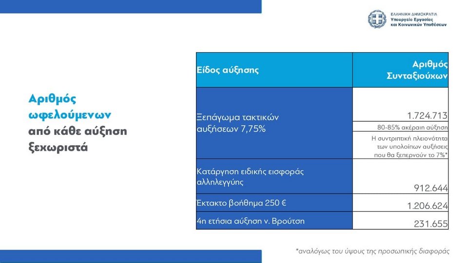 -Από την οριζόντια αύξηση του 7,75% θα ωφεληθούν 1.724.713 συνταξιούχοι.