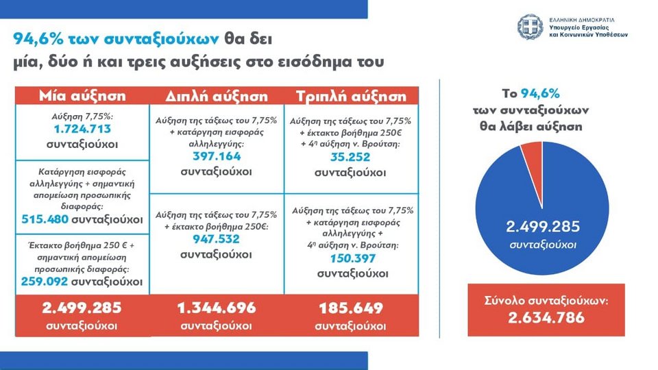 Αυξήσεις στο 94,6% των συνταξιούχων, διπλές αυξήσεις σε σχεδόν 1,3 εκατομμύρια συνταξιούχους, τριπλές αυξήσεις σε περίπου 185.000 και μια επιπλέον σύνταξη σε 1 στους 2 συνταξιούχους.