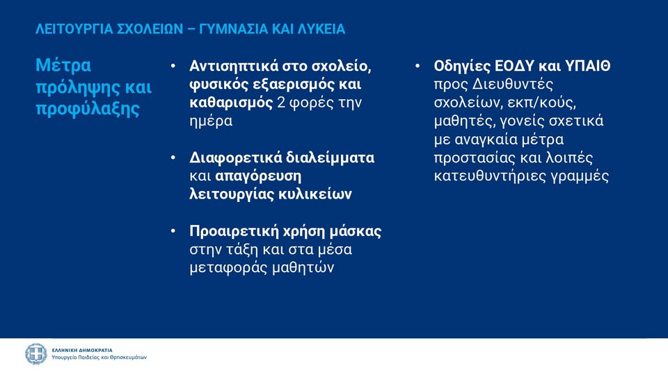 - Προ της έναρξης, θα σταλούν στους Διευθυντές των σχολείων οδηγίες του ΕΟΔΥ και του Υπουργείου, οι οποίες θα γνωστοποιηθούν σε εκπαιδευτικούς, μαθητές και γονείς, σχετικά με αναγκαία μέτρα προστασίας.