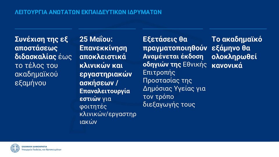Εξ αποστάσεως θα συνεχίσει να είναι η διδασκαλία στα Πανεπιστήμια. Από την 25η Μαΐου, θα υπάρχει η δυνατότητα να πραγματοποιούνται δια ζώσης εργαστηριακές και κλινικές ασκήσεις.