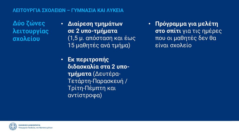 Σύμφωνα με την υπουργό Παιδείας, οι μαθητές θα πηγαίνουν στο σχολεία σε εκ περιτροπής υπο-τμήματα (που θα προκύψουν από τη διαίρεση του τμήματος στα δύο) με στόχο τη μείωση του συγχρωτισμού εντός της ίδιας αίθουσας. Η απόσταση μεταξύ μαθητών θα πρέπει να είναι 1,5 μ. και ανώτατος αριθμός μαθητών εντός τάξης τα 15 άτομα.