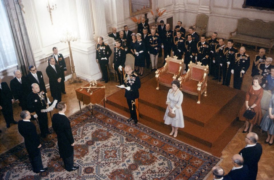 Η τελευταία φορά που είχαν παρουσιαστεί τα τρία εμβλήματα μαζί ήταν τον Δεκέμβριο 1959, στην τελετή παράδοσής τους από τον Οίκο των Βίτελσμπαχ στον τότε βασιλιά των Ελλήνων Παύλο. Μετά από διπλωματικές διαπραγματεύσεις, ο αρχηγός του Οίκου των Βίτελσμπαχ, Αλβέρτος, προσέφερε τα εμβλήματα του θρόνου ξανά στην Ελλάδα. Η τελετή της παράδοσής τους έγινε στο Ανάκτορο της Αθήνας (νυν Προεδρικό Μέγαρο), τον Δεκέμβριο του 1959, παρουσία του πρωθυπουργού Κωνσταντίνου Καραμανλή και μελών του υπουργικού συμβουλίου. Η ημερομηνία επιλέχθηκε για να συμπέσει με την επέτειο άφιξης του Όθωνα στην Αθήνα, το 1834, και την ανακήρυξη της πόλης ως πρωτεύουσας του νέου ελληνικού βασιλείου. Ο γιος του Αλβέρτου Μαξιμιλιανός-Εμμανουήλ παρέδωσε στο βασιλικό ζεύγος τα πρώτα εμβλήματα του ελληνικού θρόνου, σε μια συμβολική ημέρα για το κράτος και την πρωτεύουσά του.
