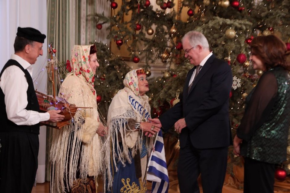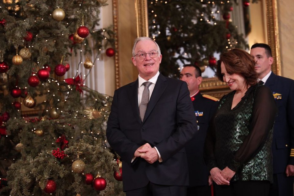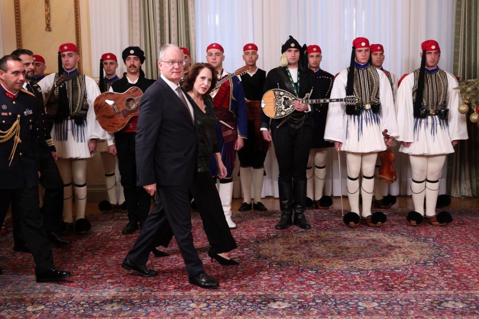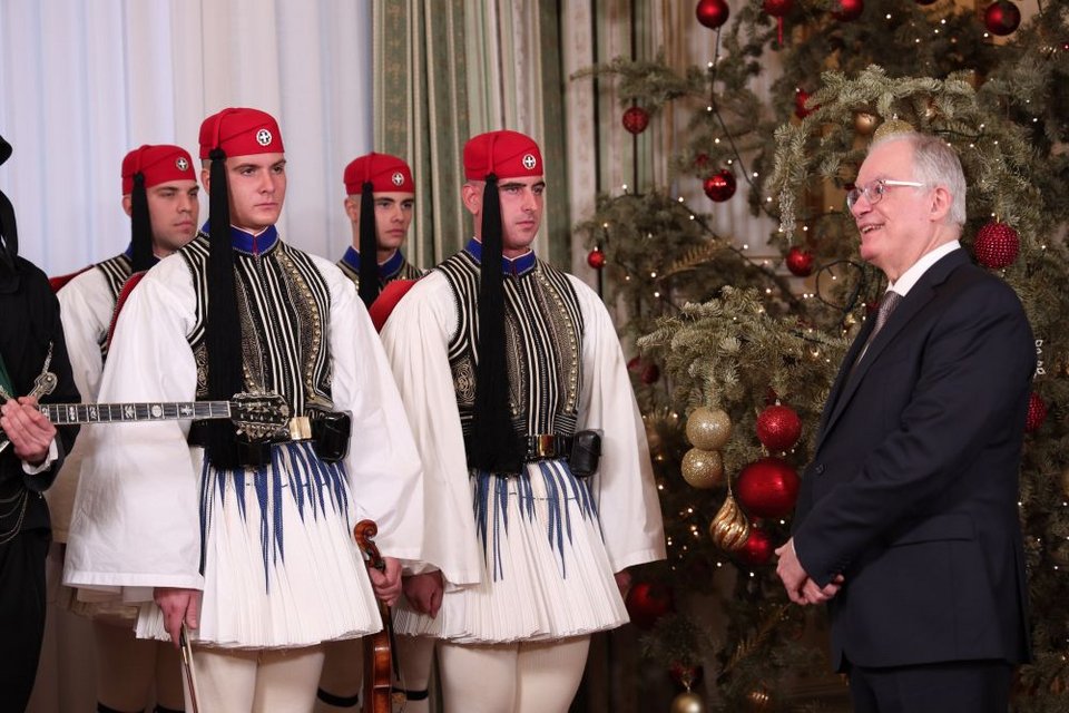 Η Μπάντα των Ενόπλων Δυνάμεων και η Προεδρική Φρουρά έψαλαν τα κάλαντα της Πρωτοχρονιάς στον Πρόεδρο της Δημοκρατίας Κωνσταντίνο Τασούλα και τη σύζυγό του Φανή Σταθοπούλου.
