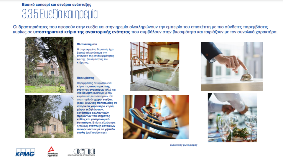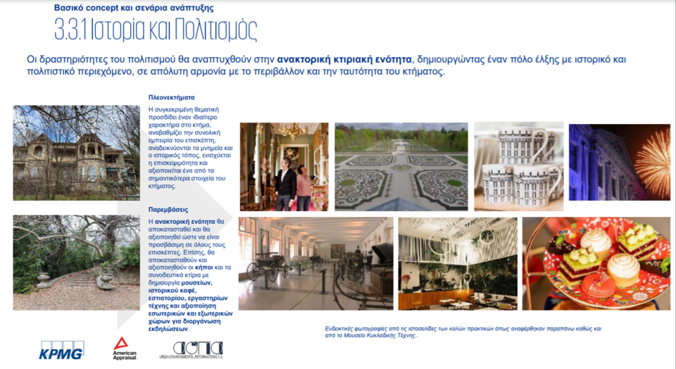 Η έκθεση βιωσιμότητας της ΚPMG (χρηματοδοτήθηκε με δωρεά του Ιδρύματος Αθανασίου Κ. Λασκαρίδη) έφτασε στο τέλος του 2020 στα χέρια του πρωθυπουργού και της υπουργού Πολιτισμού. Η Λίνα Μενδώνη έχει αναλάβει τον κεντρικό ρόλο στην επίβλεψη, τον συντονισμό και την υλοποίηση του πρότζεκτ, στο οποίο επίσης συμμετέχουν το υπουργείο Περιβάλλοντος και το υπουργείο Αγροτικής Ανάπτυξης. Η υπουργός παρουσίασε στους δημοσιογράφους την έκθεση αυτή, που καταγράφει τις ανάγκες, τις δυνατότητες, τη νέα φυσιογνωμία του κτήματος.