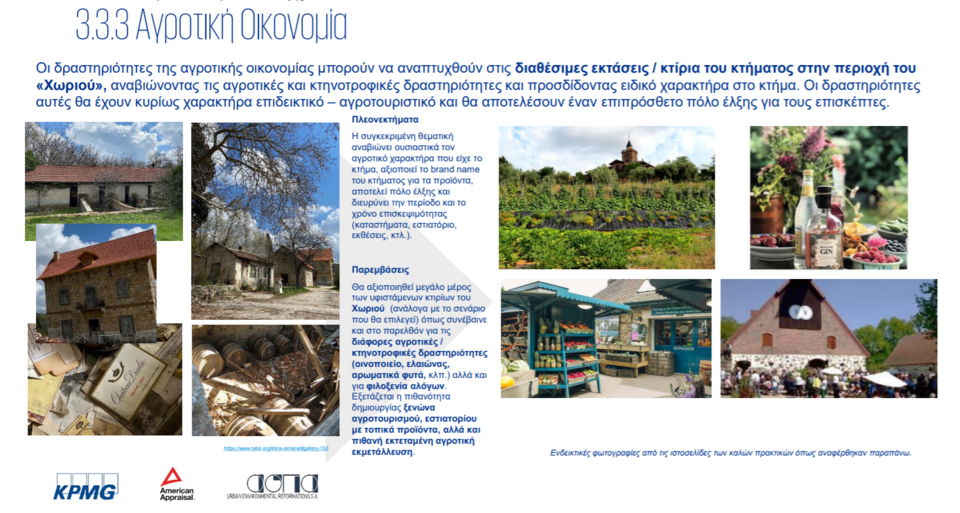 Ουσιαστικά, μιλάμε για δύο ενότητες, τη δασική ενότητα και την ενότητα του κεντρικού πυρήνα του κτήματος, ο οποίος περιλαμβάνει τα ανάκτορα, βοηθητικά κτίρια των ανακτόρων, ταφικά μνημεία, χώρο αγροτικής και κτηνοτροφικής παραγωγής και ένα τμήμα που ονομάζεται «χωριό». Στα δύο τελευταία τμήματα του κτήματος θα επιχειρηθεί να αναβιώσει το ιστορικό brand προϊόντων που παρήγαγε το κτήμα στο παρελθόν, με πρότυπες πλέον μεθόδους καλλιέργειας. Ένα μοντέλο αγροτουρισμού, που θα αποφέρει επίσης σημαντικά έσοδα στο κτήμα. Ετσι, στα κτίρια του Χωριού δεν αποκλείεται να δημιουργηθεί ακόμα και ξενώνας, ειδικό εστιατόριο (πόλος έλξης σημαντικής μερίδας ειδικής μορφής τουρισμού), ενώ θα αναβιώσουν ο αμπελώνας, ο ελαιώνας, οι εκτάσεις με τα αρωματικά φυτά.