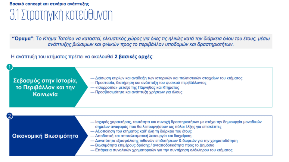 Ενας από τους πρώτους στόχους που έθεσε ο πρωθυπουργός στις προγραμματικές του δηλώσεις, η αξιοποίηση του πρώην βασιλικού κτήματος Τατοΐου δεν έχει απλώς δρομολογηθεί αλλά τρέχει ήδη ολοταχώς. Σήμερα η υπουργός Πολιτισμού παρουσίασε αναλυτικά τη μελέτη βιωσιμότητας, τη νέα μορφή του κτήματος, τα χρονοδιαγράμματα.