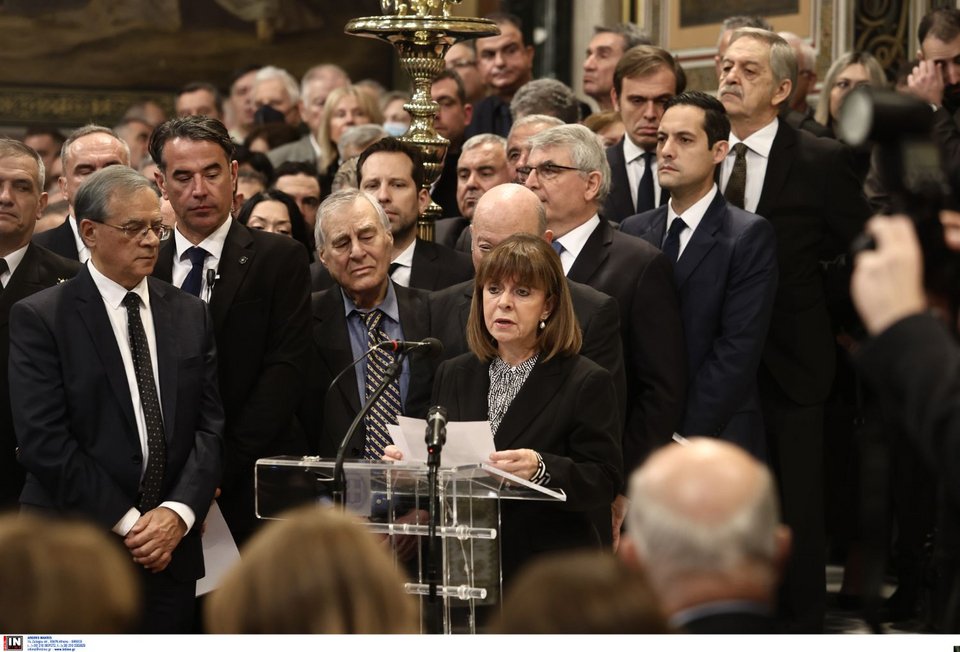 Η κ. Σακελλαροπούλου επισήμανε: «Ο Κώστας Σημίτης υπερασπίστηκε, με συνέπεια και πεποίθηση, πάθος και λογική, λέξεις και πράξεις, σε όλη του τη ζωή, τη δημοκρατία και τις αρχές της. Αγωνιστής κατά της δικτατορίας, διακεκριμένος ακαδημαϊκός δάσκαλος, άνθρωπος των ιδεών και του πρακτικού λόγου, άφησε το βαθύ αποτύπωμά του στη Μεταπολίτευση με το δικό του, ξεχωριστό και διαχρονικό, πολιτικό παράδειγμα».