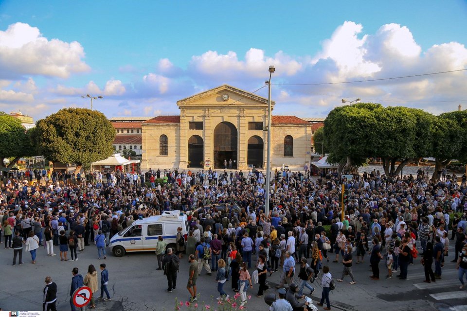 Υπό τους ήχους της Φιλαρμονικής του Δήμου Χανίων, που παιάνιζαν συνθέσεις του Μίκη Θεοδωράκη, πλήθος κόσμου βρέθηκε από νωρίς στη Δημοτική Αγορά για να πει το τελευταίο «αντίο» στον άνθρωπο που έκανε μέσω του έργου του γνωστή την Ελλάδα σε όλο τον κόσμο.
