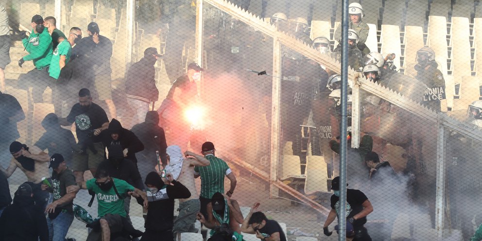 Οπαδοί και των δυο ομάδων έχουν σπάσει κιγκλιδώματα και προσπαθούν να φτάσουν οι μεν τους δε, ενώ βρίσκονται στη μέση οι άνδρες των ΜΑΤ.