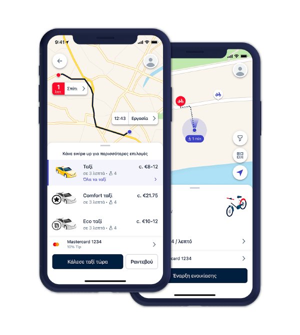 Ξεκινάμε με τέσσερις τρόπους μετακίνησης, σε Αθήνα και Θεσσαλονίκη - όλοι σε μία εφαρμογή. Τα ταξί θα είναι προφανώς διαθέσιμα, και τώρα θα έχεις επιλογή μεταξύ τριών τύπων στόλου: