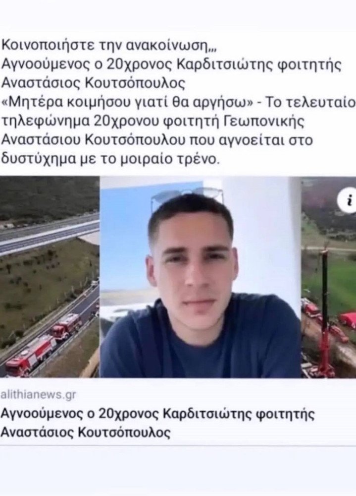 O 20χρονος Αναστάσιος Κουτσόπουλος, φοιτητής Γεωπονικής στο Αριστοτέλειο Πανεπιστήμιο Θεσσαλονίκης, ήταν ένας από τους επιβάτες της μοιραίας αμαξοστοιχίας