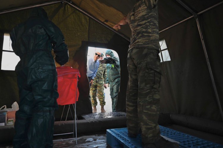 Μετά την επίσκεψη στην έδρα της 1ης Στρατιάς στη Λάρισα επιθεωρήσαμε με τον Αρχηγό ΓΕΕΘΑ Στρατηγό Κωνσταντίνο Φλώρο, το στρατόπεδο Μπουγά στη Λάρισα, στο οποίο βρίσκεται ένας εξ αυτών των σταθμών απολύμανσης προσωπικού και οχημάτων».