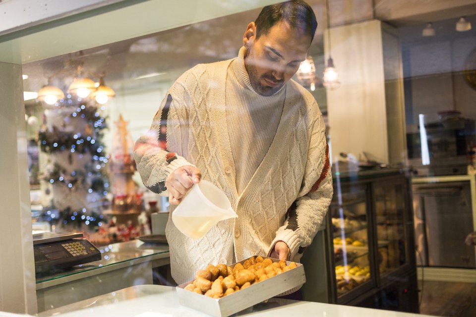 Οι αδερφές Δεληγεωργάκη , ειδικά τις μέρες των γιορτών, περνούν ατελείωτες ώρες στο μικρό εργαστήριο, στο πίσω μέρος του μαγαζιού όπου κατασκευάζονται όλα όσα διατίθενται στο κατάστημα, εξυπηρετώντας ταυτόχρονα και τους πελάτες . Όπως κάθε χρόνο, έχουν δεκάδες παραγγελίες για την τριφτή βασιλόπιτα, «σημαδεμένη» με την ξύλινη σφραγίδα του παππού που εικονίζει τον Αγιο Βασίλειο.