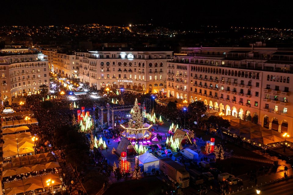 Φωταγωγήθηκε το χριστουγεννιάτικο δέντρο στη Θεσσαλονίκη, με τα 100.000 λαμπιόνια να το κοσμούν και να φωτίζουν όλη την Πλατεία Αριστοτέλους.