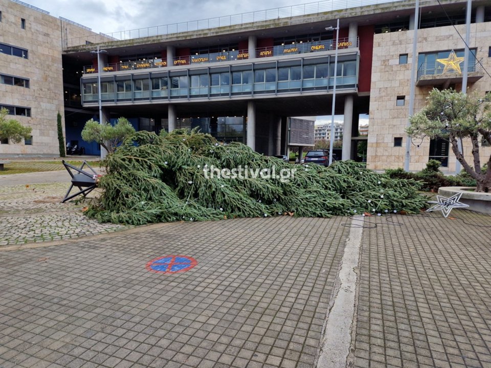Κατέρρευσε το πρωί της Παρασκευής το χριστουγεννιάτικο δέντρο που είχε στηθεί μπροστά στο δημαρχείο Θεσσαλονίκης, εξαιτίας των ισχυρών ανέμων.