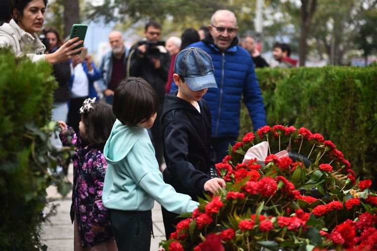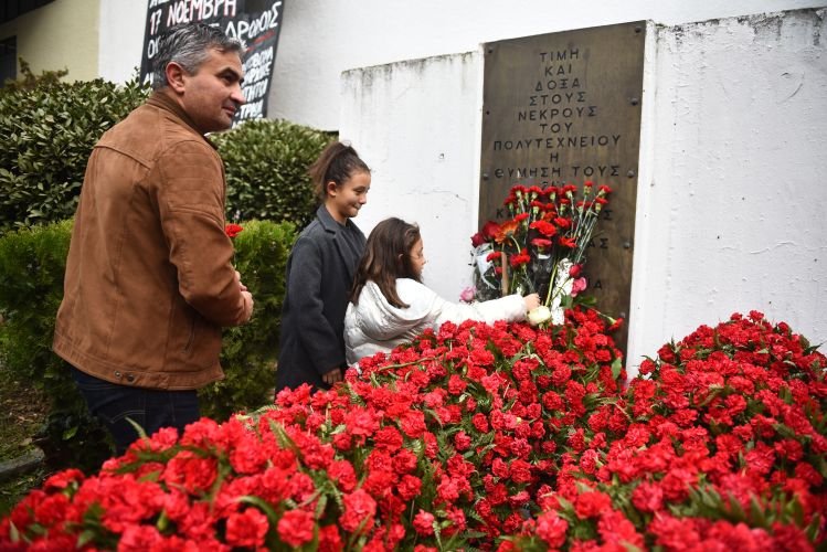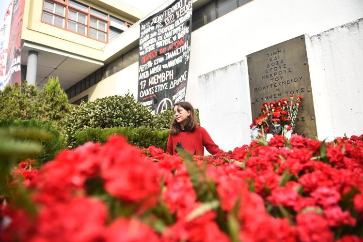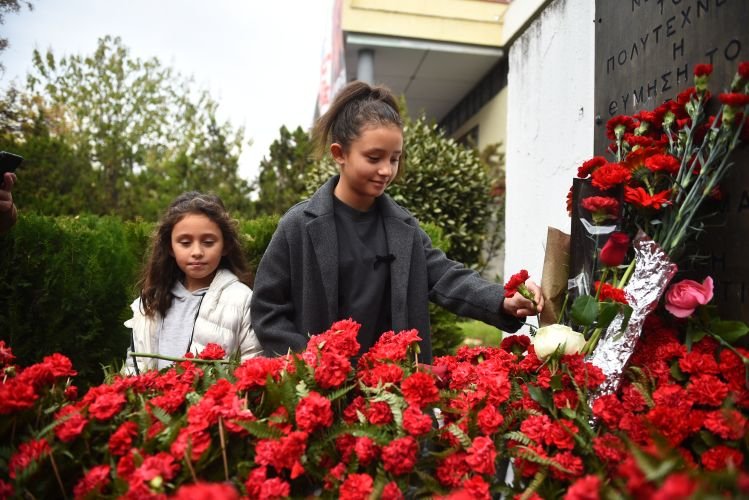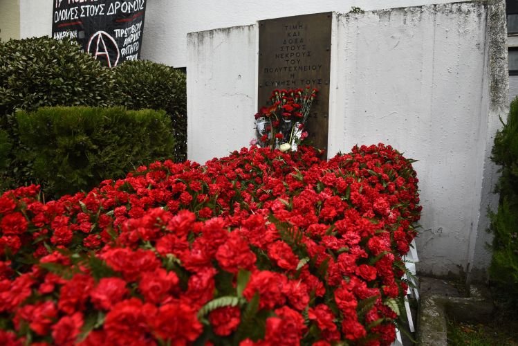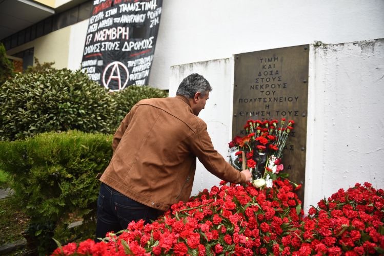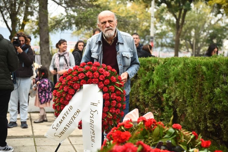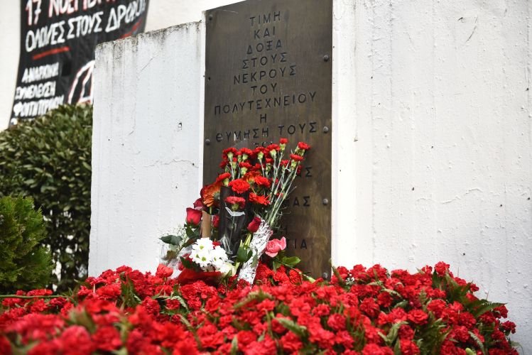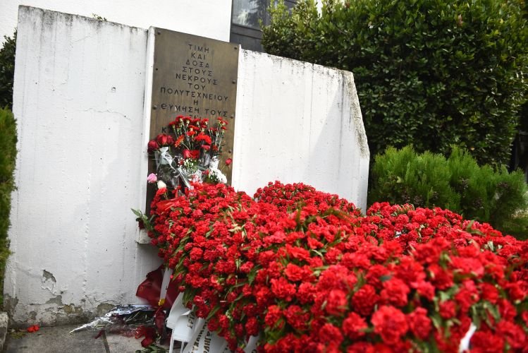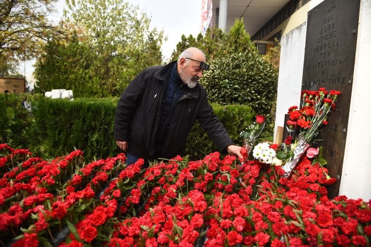 Στεφάνια και λουλούδια καταθέτουν από το πρωί πολίτες κάθε ηλικίας στο μνημείο της Πολυτεχνικής Σχολής, τιμώντας την επέτειο της εξέγερσης του Πολυτεχνείου, στη Θεσσαλονίκη.