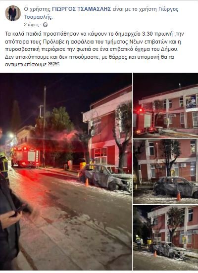 Μάλιστα, ο ίδιος δημοσίευσε και σχετικές φωτογραφίες από το συμβάν γράφοντας: Τα καλά παιδιά προσπάθησαν να κάψουν το δημαρχείο 3:30 πρωινή, την απόπειρα τους πρόλαβε η ασφάλεια του τμήματος Νέων επιβατών και η πυροσβεστική περιόρισε την φωτιά σε ένα επιβατικό όχημα του Δήμου. Δεν υποκύπτουμε και δεν πτοούμαστε, με θάρρος και υπομονή θα τα αντιμετωπίσουμε.