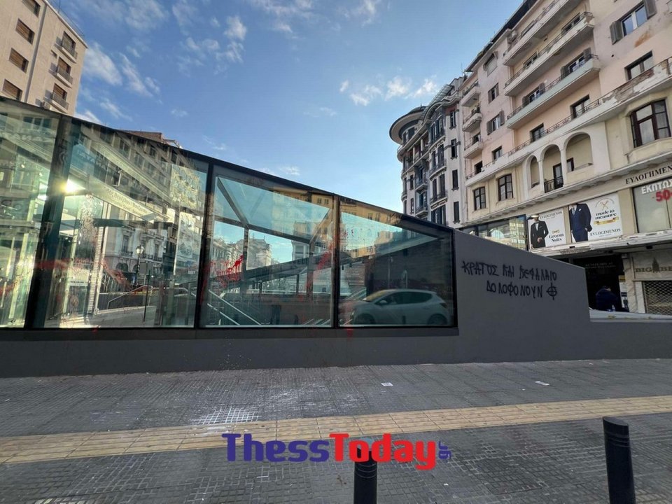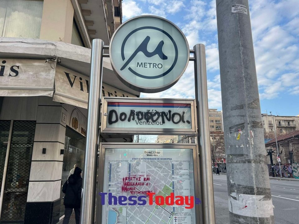 Σύμφωνα με το thesstoday, πέταξαν κόκκινες μπογιές πάνω στις τζαμαρίες του σταθμού Βενιζέλου, στο κέντρο της πόλης. Σε άλλα σημεία έγραψαν συνθήματα, ενώ πάνω στην πινακίδα που αναγράφεται η ονομασία της στάσης έγραψαν με κεφαλαία γράμματα τη λέξη «δολοφόνοι».