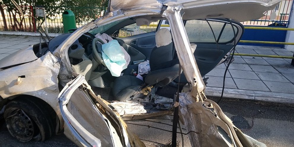 Το ένα αυτοκίνητο έχει κοπεί σε δύο κομμάτια, τα οποία αποτελούν άμορφες μάζες σιδερικών.