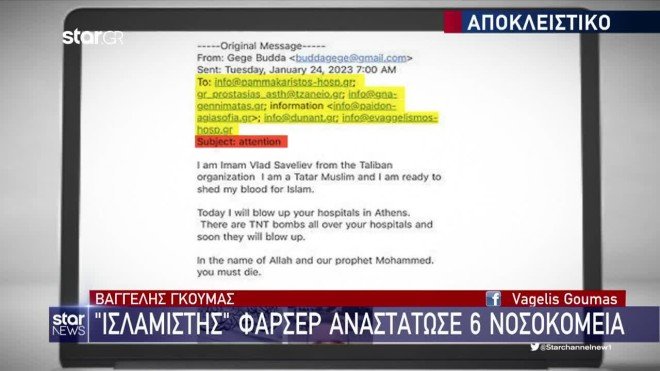 Από τις φωτογραφίες που παρουσίασε το Star, ο «ισλαμιστής» φέρεται να έγραψε στο μήνυμα ηλεκτρονικού ταχυδρομείου: «Είμαι ο ιμάμης Βλαντ Σεβελίεφ, από την οργάνωση των Ταλιμπάν. Είμαι Τατάρος Μουσουλμάνος και είμαι έτοιμος να χύσω το αίμα μου για το Ισλάμ. Σήμερα θα ανατινάξω τα νοσοκομεία σας στην Αθήνα. Υπάρχουν TNT βόμβες στα νοσοκομεία σας και σύντομα θα ανατιναχθούν. Στο όνομα του Αλλάχ και του προφήτη Μωάμεθ πρέπει να πεθάνετε».