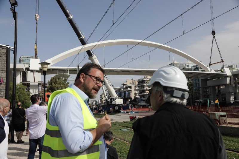 Το μεσημέρι του Σαββάτου οι ειδικοί γερανοί που μετέφεραν την τεράστια πεζογέφυρα την τοποθέτησαν στη θέση της, στη συμβολή της λ. Ποσειδώνος με την Καλαμακίου.