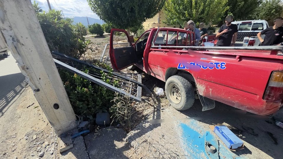 Το ΙΧ καρφώθηκε σε τσιμεντένια κολώνα σε είσοδο σπιτιού -Το αγροτικό κατέληξε στην αυλή, γκρέμισε σιδερένια αυλόπορτα