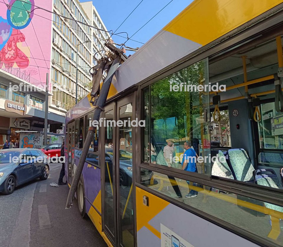 Το καλώδιο του τρόλεϊ που προπορευόταν έπεσε πάνω στο διώροφο τουριστικό λεωφορείο ανοιχτού τύπου που ακολουθούσε, με αποτέλεσμα να σπάσουν τα τζάμια του και να προκληθούν κάποιες φθορές.