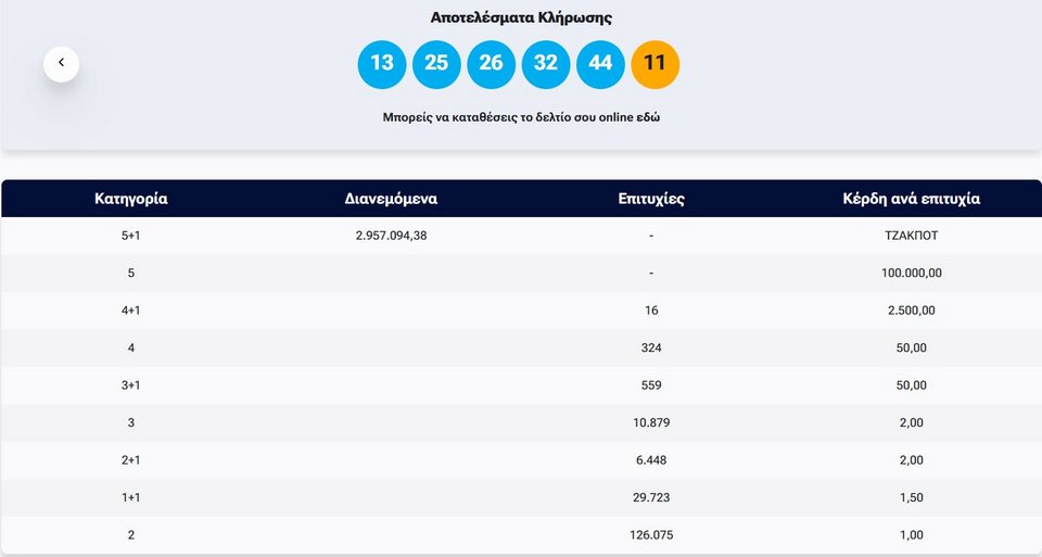 Στην επόμενη κλήρωση, την ερχόμενη Τρίτη, στην πρώτη κατηγορία θα μοιραστούν 3,2 εκατ. ευρώ.