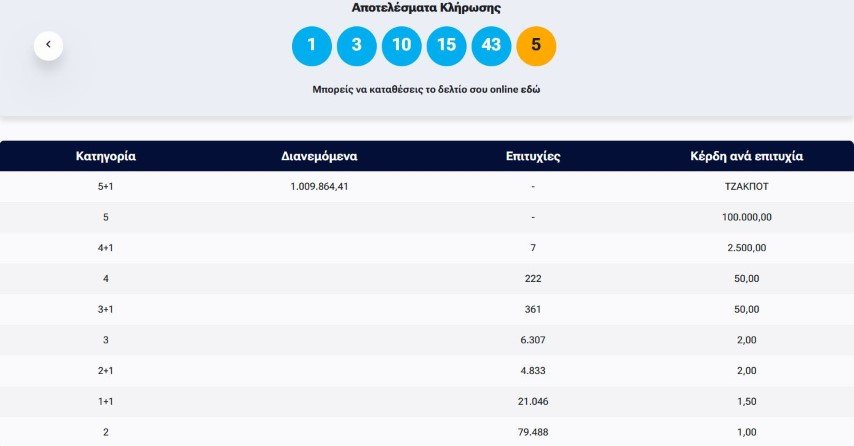 Οι τυχεροί αριθμοί ήταν οι: 1, 3, 10, 15, 43 και τζόκερ το 5.