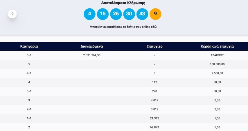 Οι τυχεροί αριθμοί ήταν οι: 4, 15, 26, 30, 43 και τζόκερ το 9.