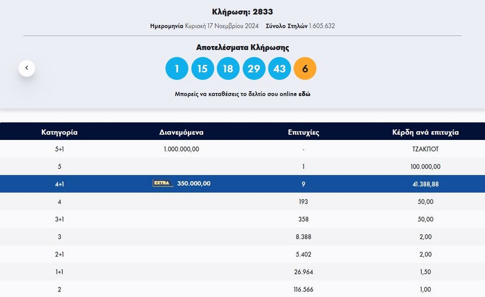 Δεδομένου ότι στην πρώτη κατηγορία δεν βρέθηκε κάποιος νικητής για το 1.000.000 ευρώ, το ποσό μεταφέρεται για την επόμενη κλήρωση, την Τρίτη 19 Νοεμβρίου.
