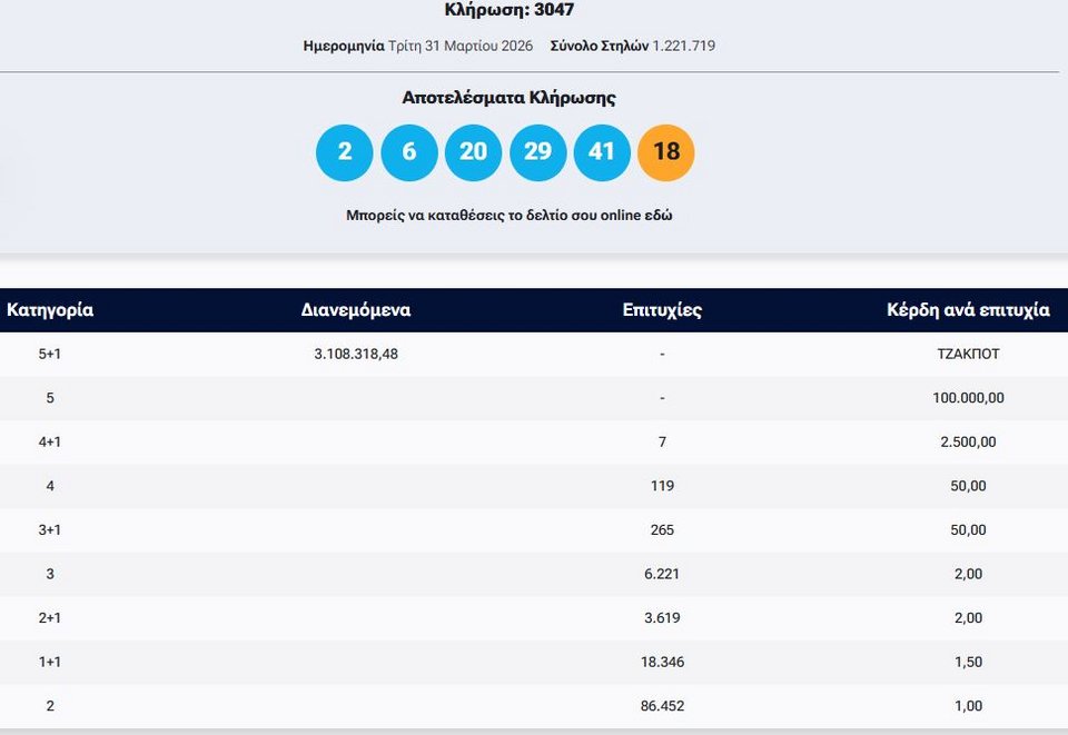 Διπλό τζακ ποτ σημειώθηκε σήμερα (31/3) στο Τζόκερ.