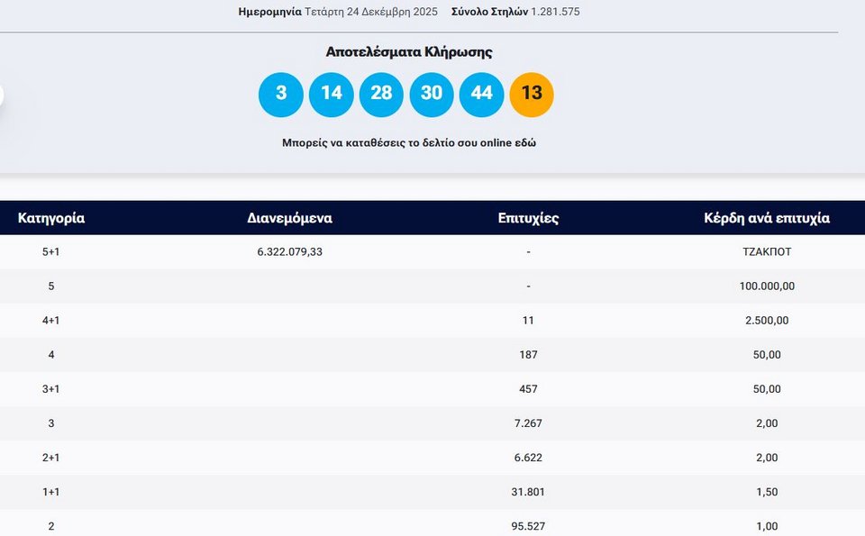 Οι αριθμοί που κληρώθηκαν είναι οι εξής: 3, 14, 28, 30, 44 και τζόκερ το 13.