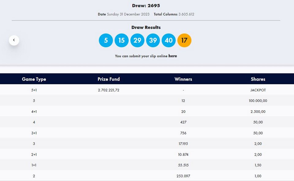 Τζακ ποτ σημειώθηκε στο Τζόκερ, στην κλήρωση 2695, τελευταία για το 2023, που πραγματοποιήθηκε το βράδυ της Κυριακής 31 Δεκεμβρίου 2023.