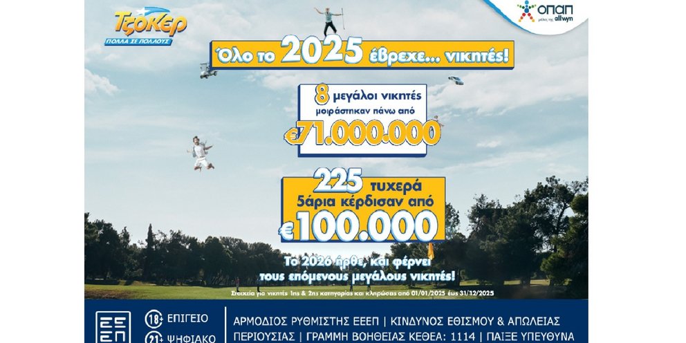ΤΖΟΚΕΡ: 8 υπερτυχεροί μοιράστηκαν πάνω από 71 εκατ. ευρώ το 2025
