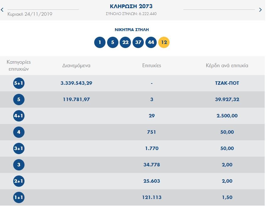Οι τυχεροί αριθμοί του Τζόκερ, είναι οι εξής: 1, 5, 22, 37, 44 και αριθμός Τζόκερ το 12.