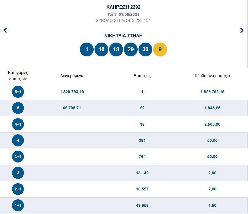 Οι τυχεροί αριθμοί είναι: 1, 16, 18, 29, 30 και αριθμός Τζόκερ το 9.