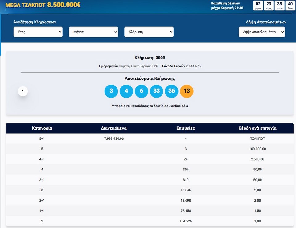 Οι τυχεροί αριθμοί ήταν οι: 3, 4, 6, 33, 36 και τζόκερ το 13.