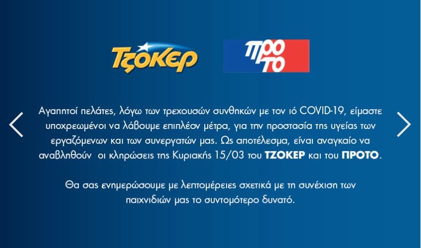 «Λόγω των τρεχουσών συνθηκών με τον κορωνοϊό covid-19, αναγκαστήκαμε να αναβάλουμε τις σημερινές (15/3) κληρώσεις Τζόκερ και ΠΡΟΤΟ. θα σας ενημερώσουμε για την συνέχιση των παιχνιδιών μας το συντομότερο δυνατόν» ανέφερε το μήνυμα συγκεκριμένα.