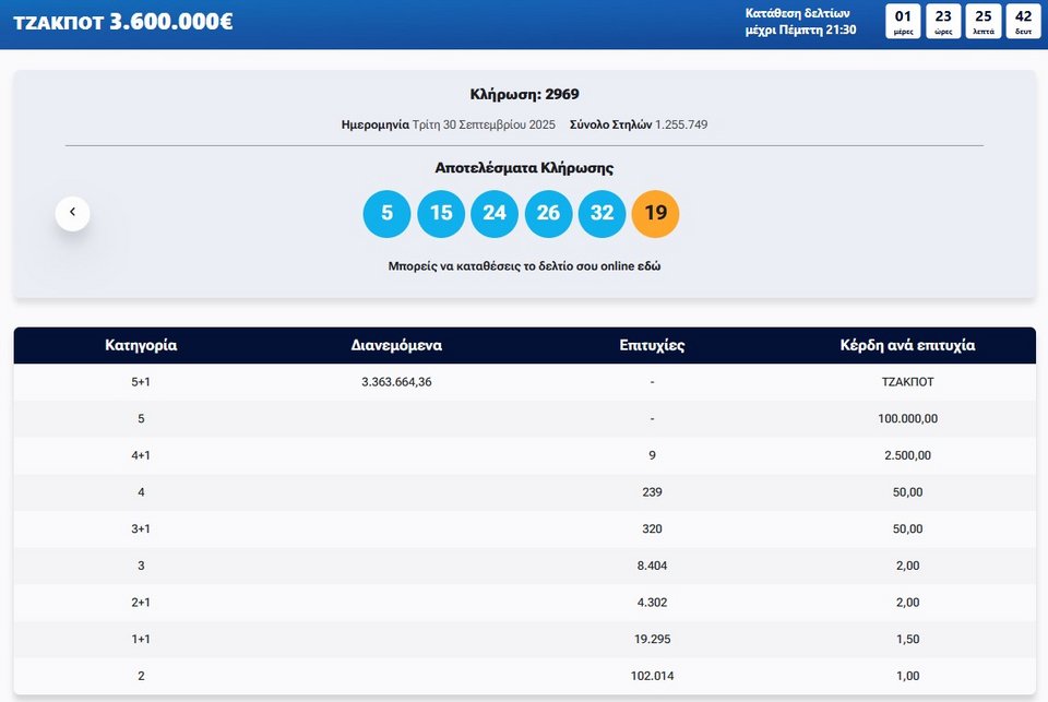 Οι αριθμοί που κληρώθηκαν είναι: 5, 15, 24, 26, 32 και αριθμός τζόκερ το 19