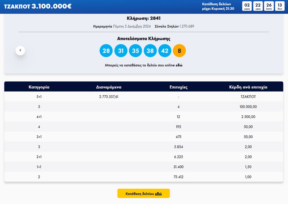 Οι τυχεροί αριθμοί στην κλήρωση της Πέμπτης ήταν οι εξής: 28, 31, 35, 38, 42 και αριθμός τζόκερ το 8.