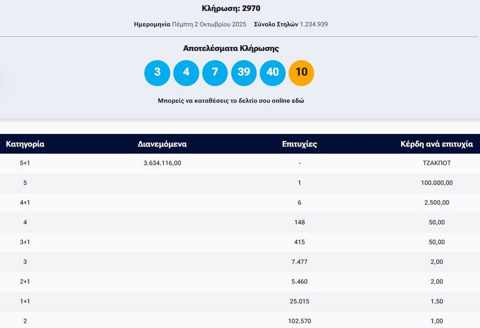 Τα νούμερα που κληρώθηκαν είναι τα εξής: 3, 4, 7, 39, 40 και τζόκερ το 10.