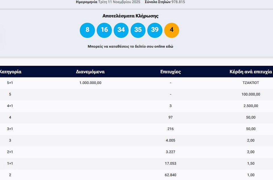 Στην κλήρωση της Πέμπτης (13/11) το ποσό της πρώτης κατηγορίας παραμένει στο 1 εκατομμύριο ευρώ.